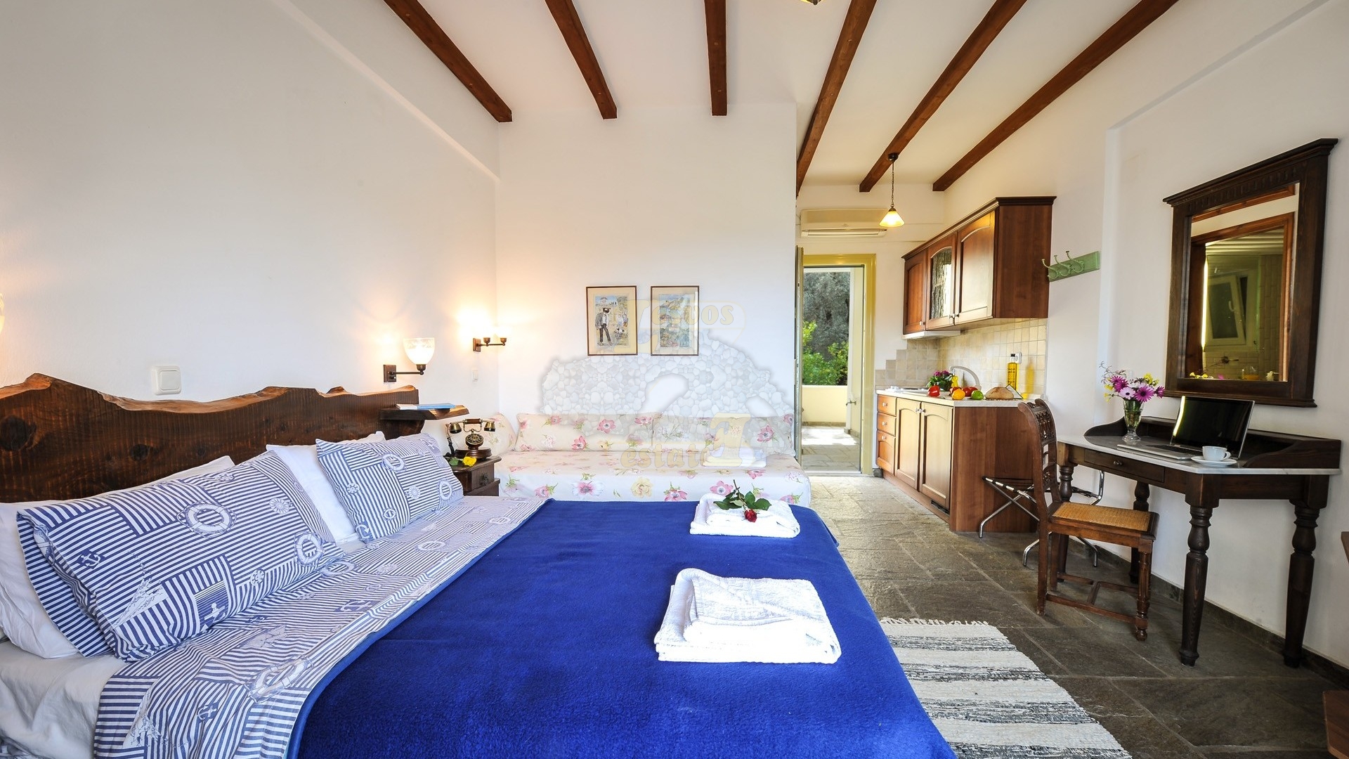 α) ένα ισόγειο διαμέρισμα 42,97 τ.μ. με θέα την θάλασσα.